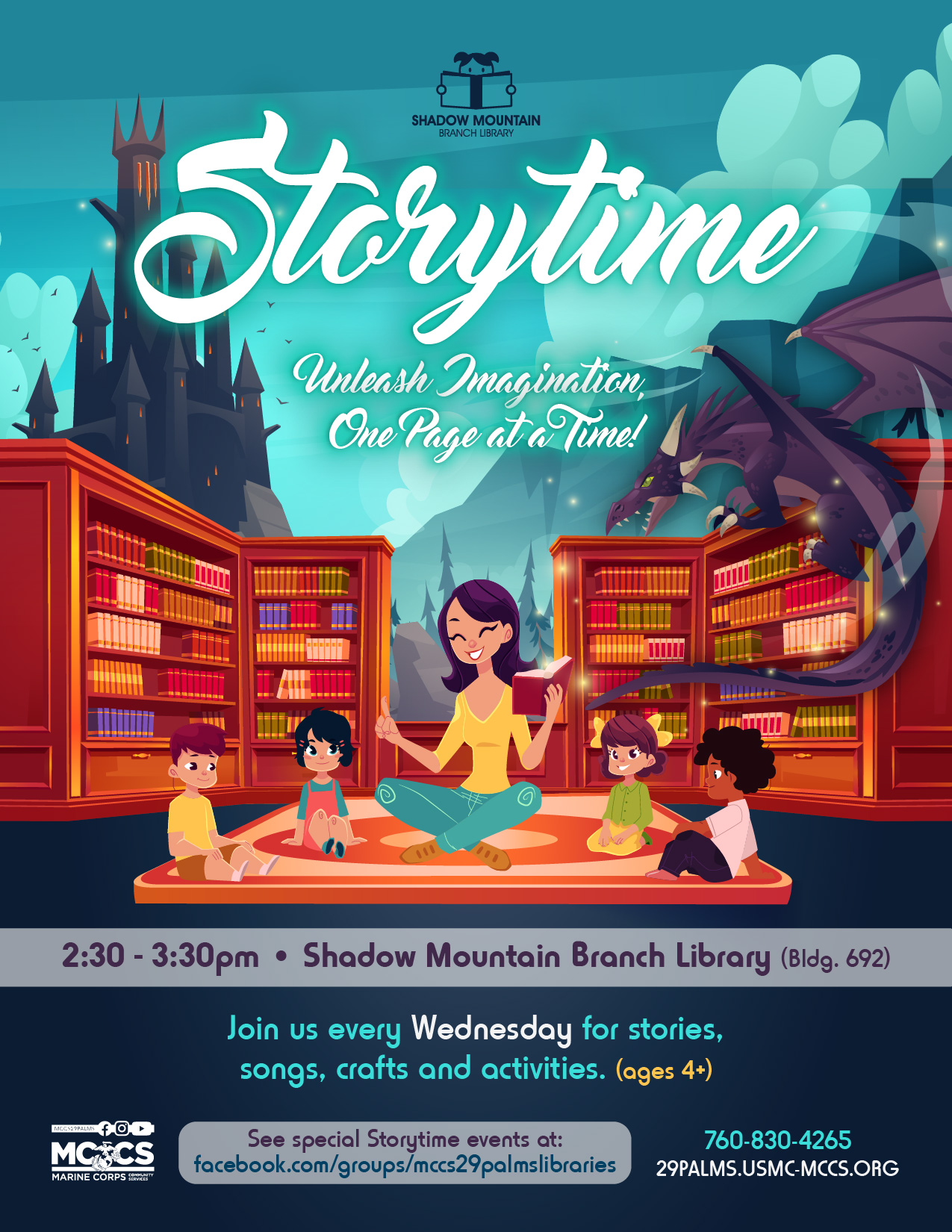 Join us every Wednesday from 2:30 - 3:30pm for stories, songs and activities. (ages 4+)
