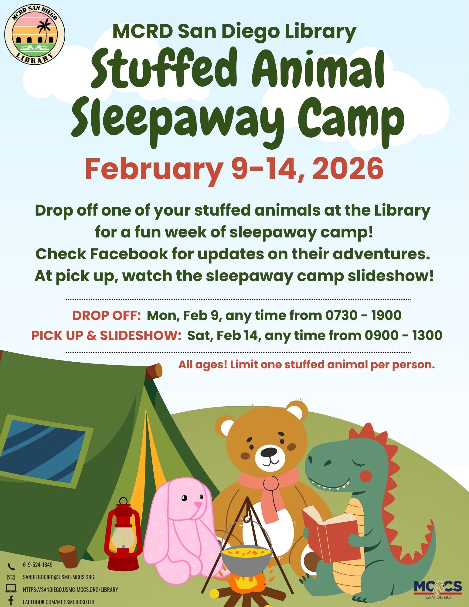 Drop off one of your stuffed animals at the Library for a fun week of sleepaway camp! Check Facebook (https://www.facebook.com/mccsmcrdsd.lib) for daily updates on their adventures. At pick up, watch the sleepaway camp slide show!